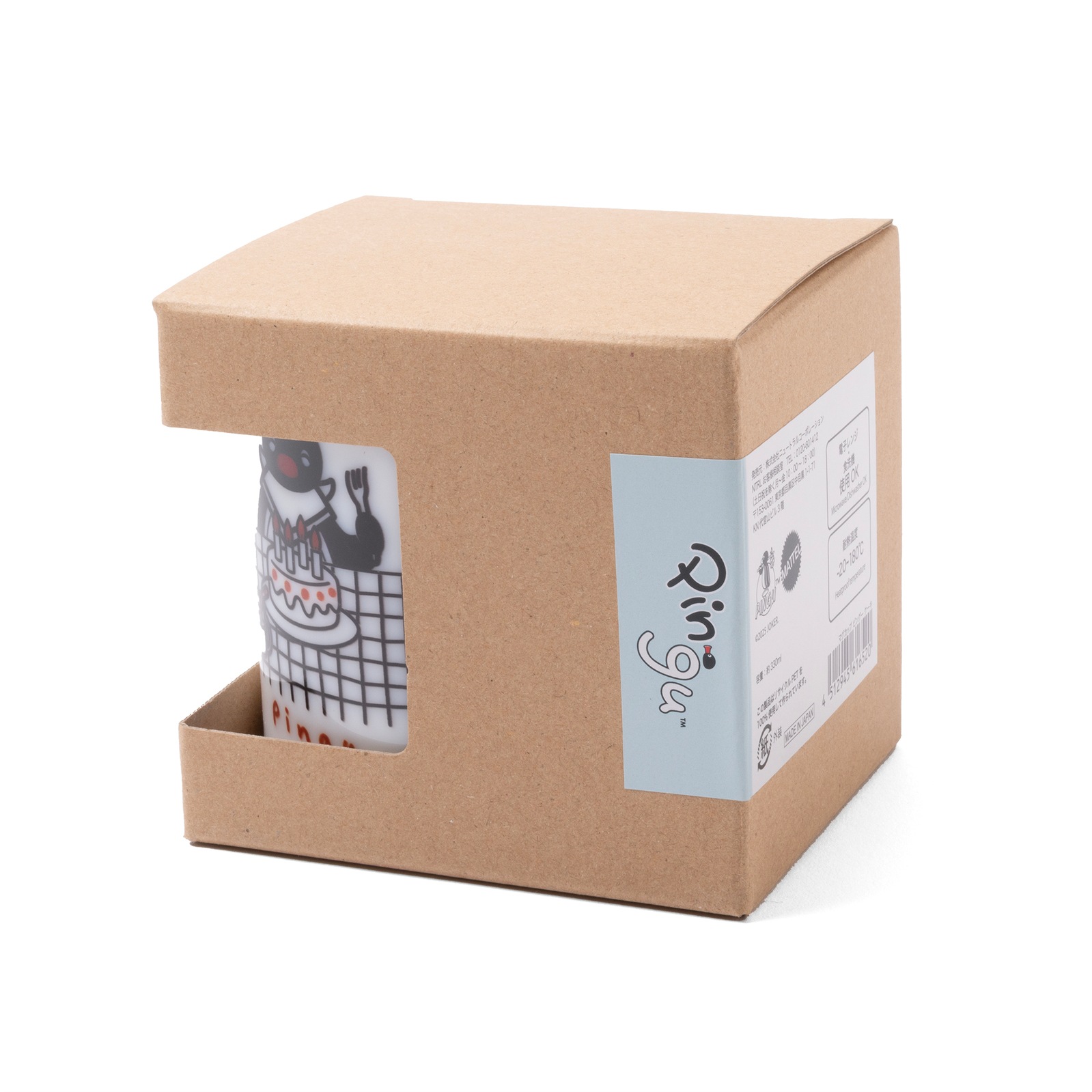 ピングーとケーキがデザインされたマグカップ。軽くて電子レンジにも対応した再生PET素材を使用しています。